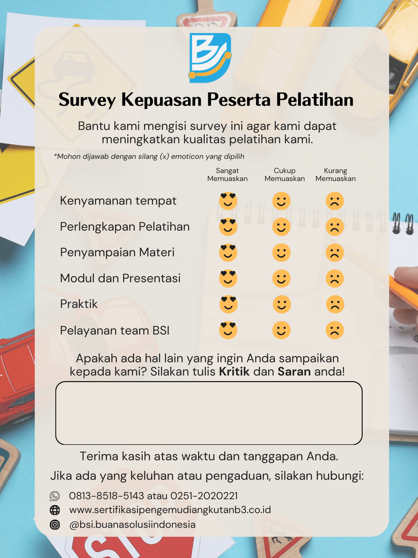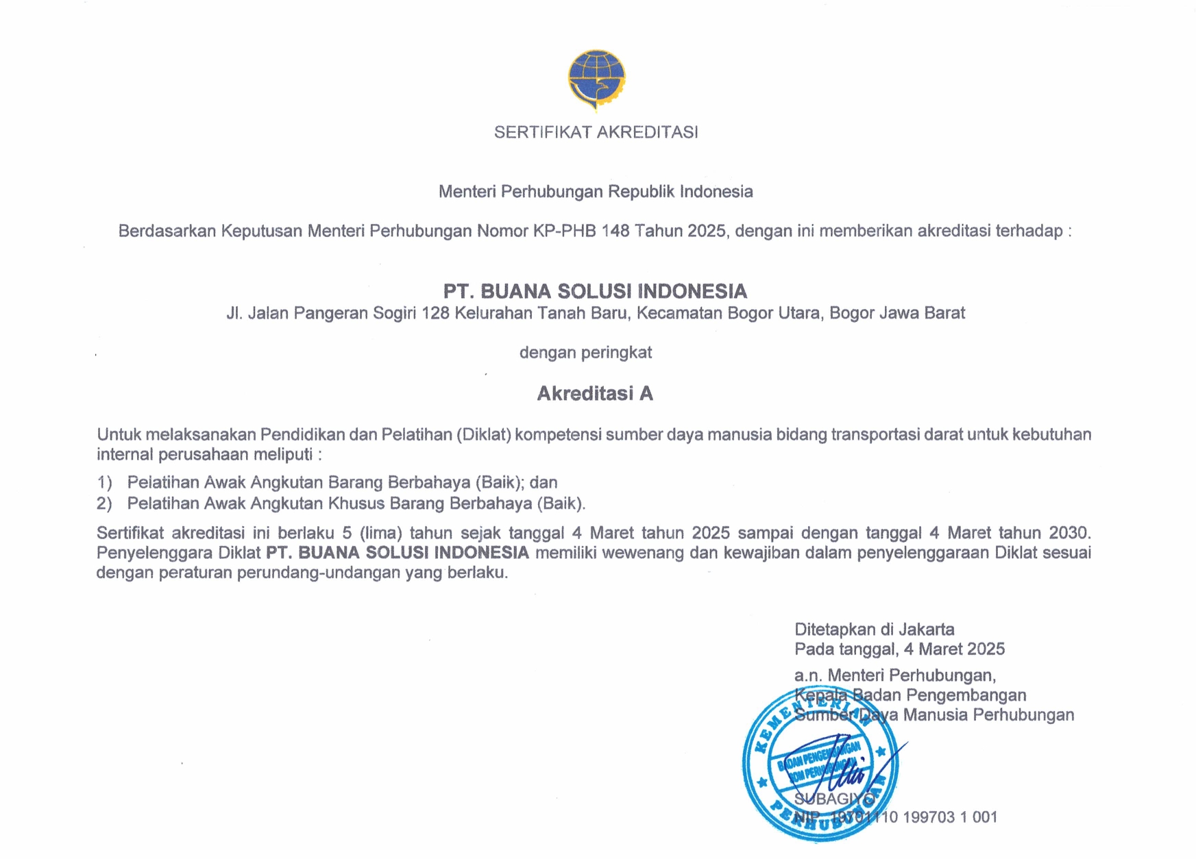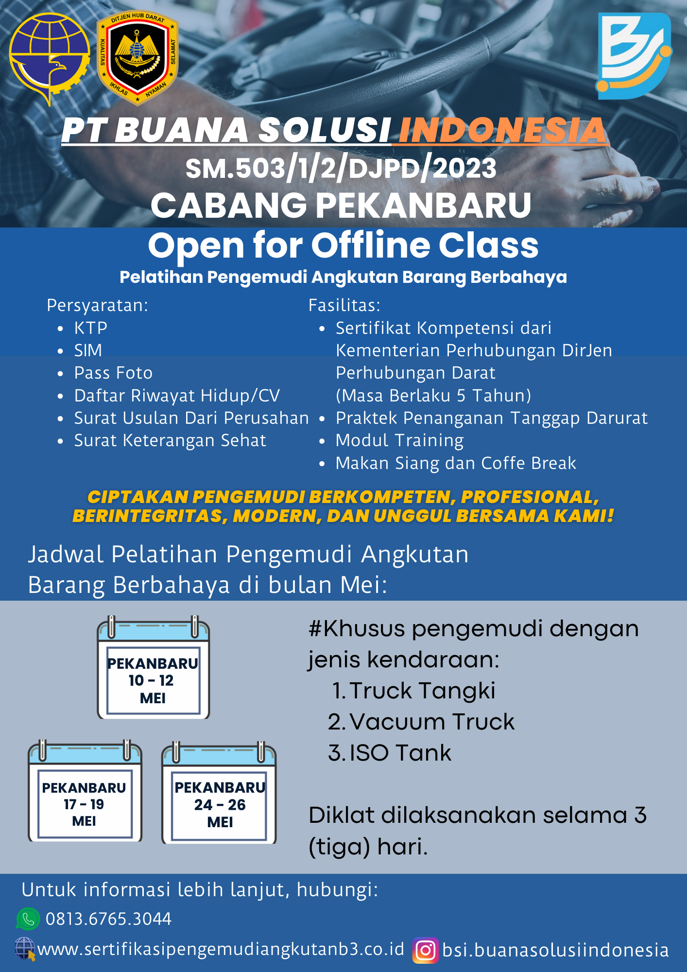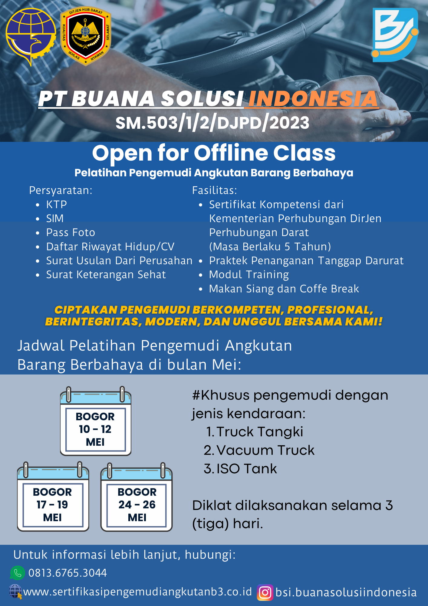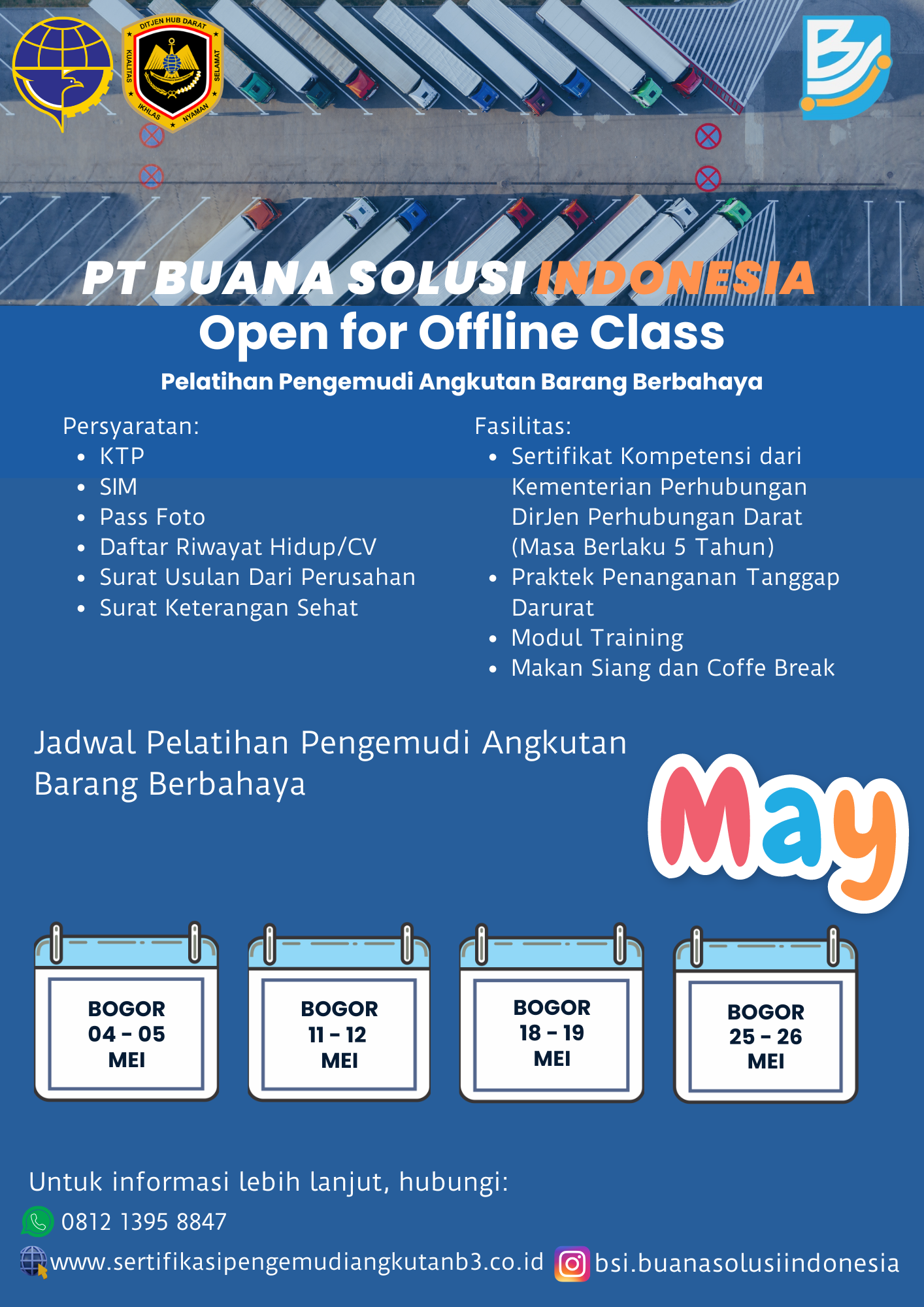 PT BUANA SOLUSI INDONESIA (BSI) didirikan pada tahun 2023 sebagai Lembaga Sertifikasi Keterampilan Pengemudi Angkutan Barang Berbahaya yang didukung oleh para tenaga ahli yang berkompeten dibidang transportasi pengangkutan barang berbahaya di jalan, yang telah mendapatkan akreditasi A berdasarkan Keputusan Menteri Perhubungan Nomor KP-PHB 148 tahun 2025 serta diakui secara sah oleh Kementerian Perhubungan Direktorat Jenderal Perhubungan Darat sesuai dengan SK Dirjen Perhubungan Darat Nomor SM.503/1/2/DJPD/2023.